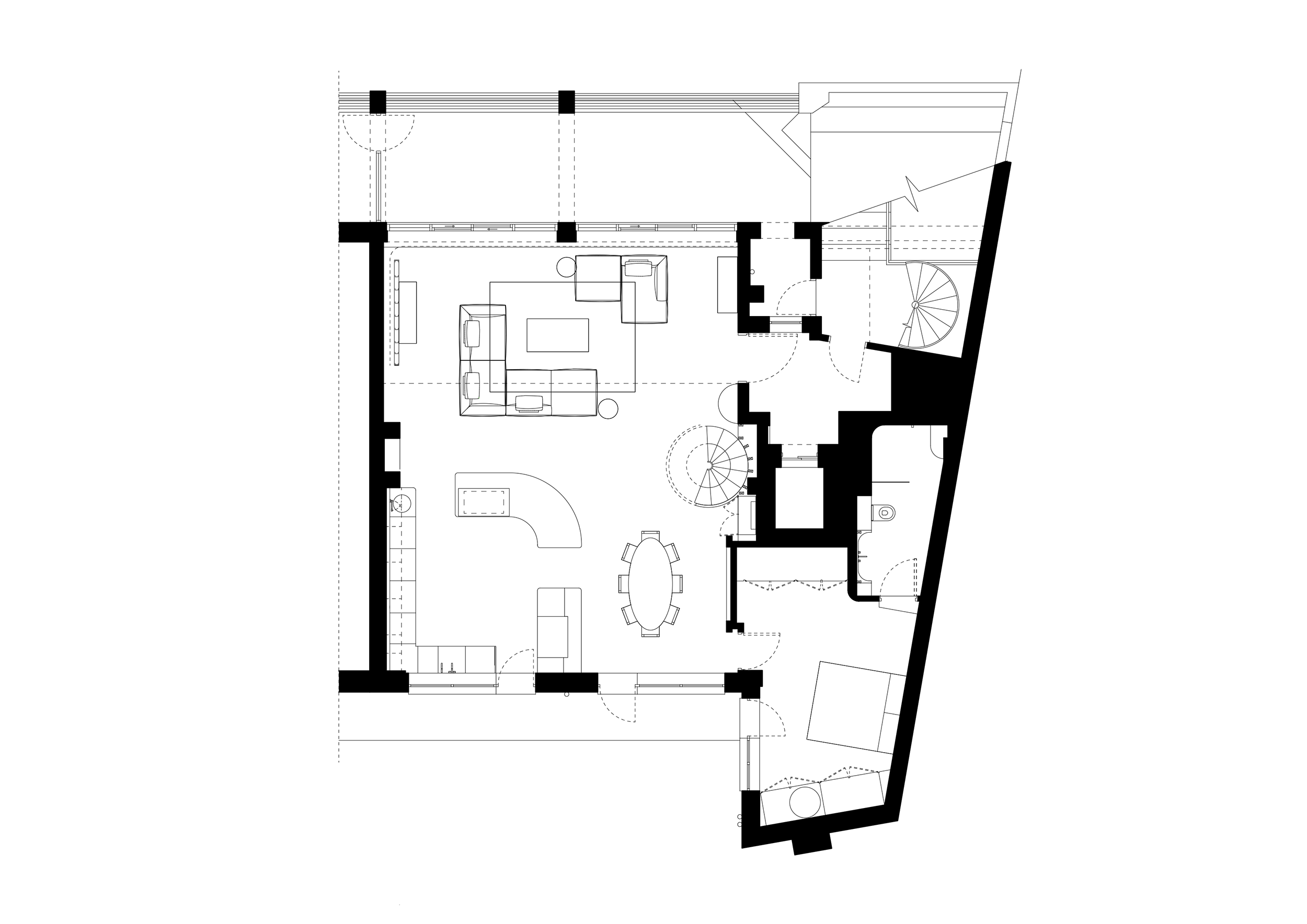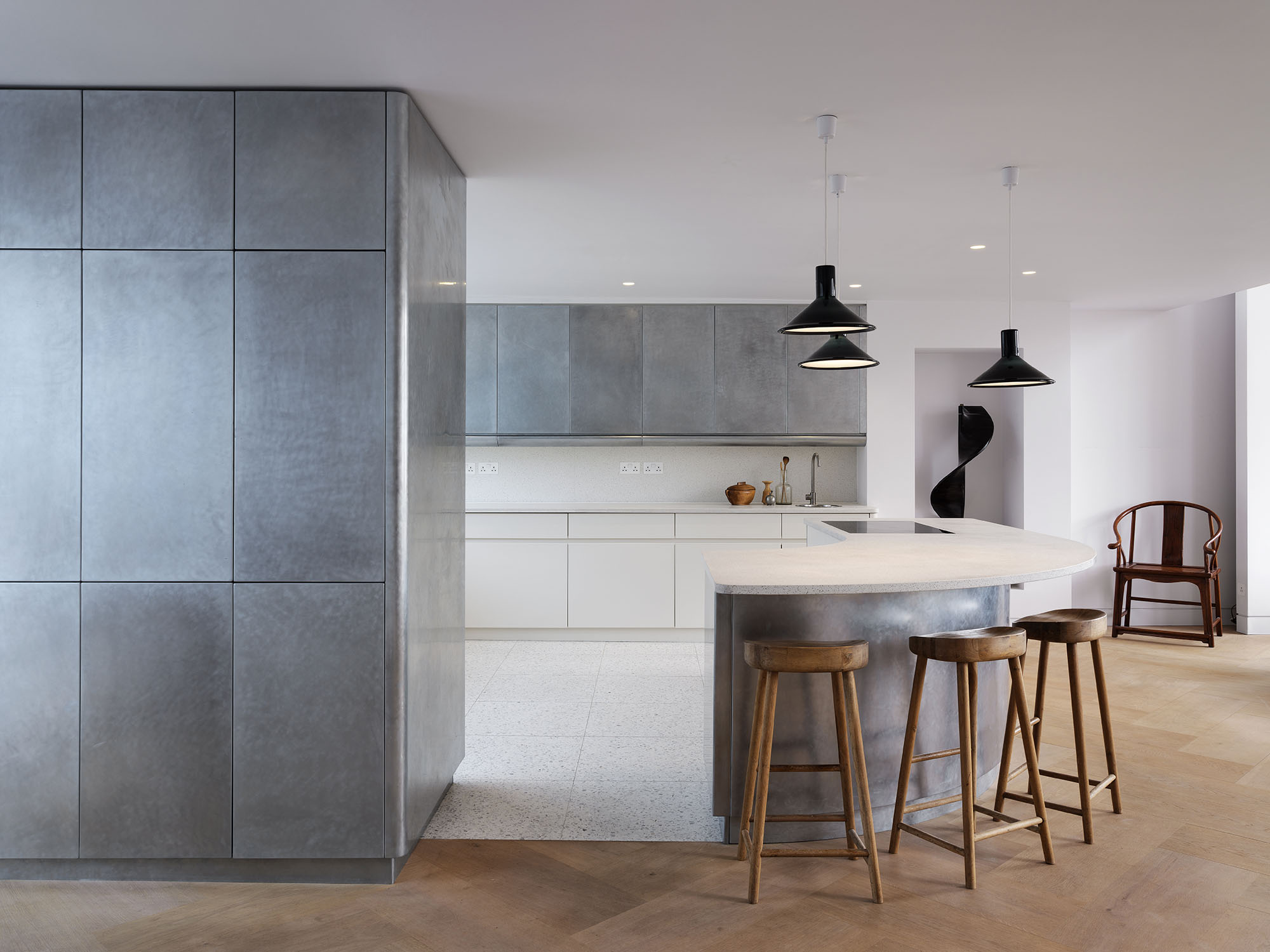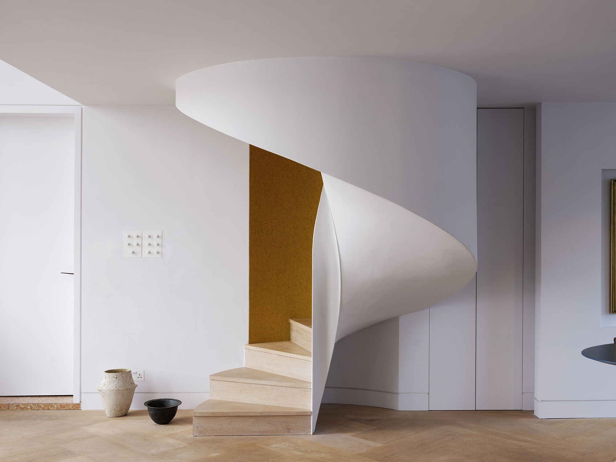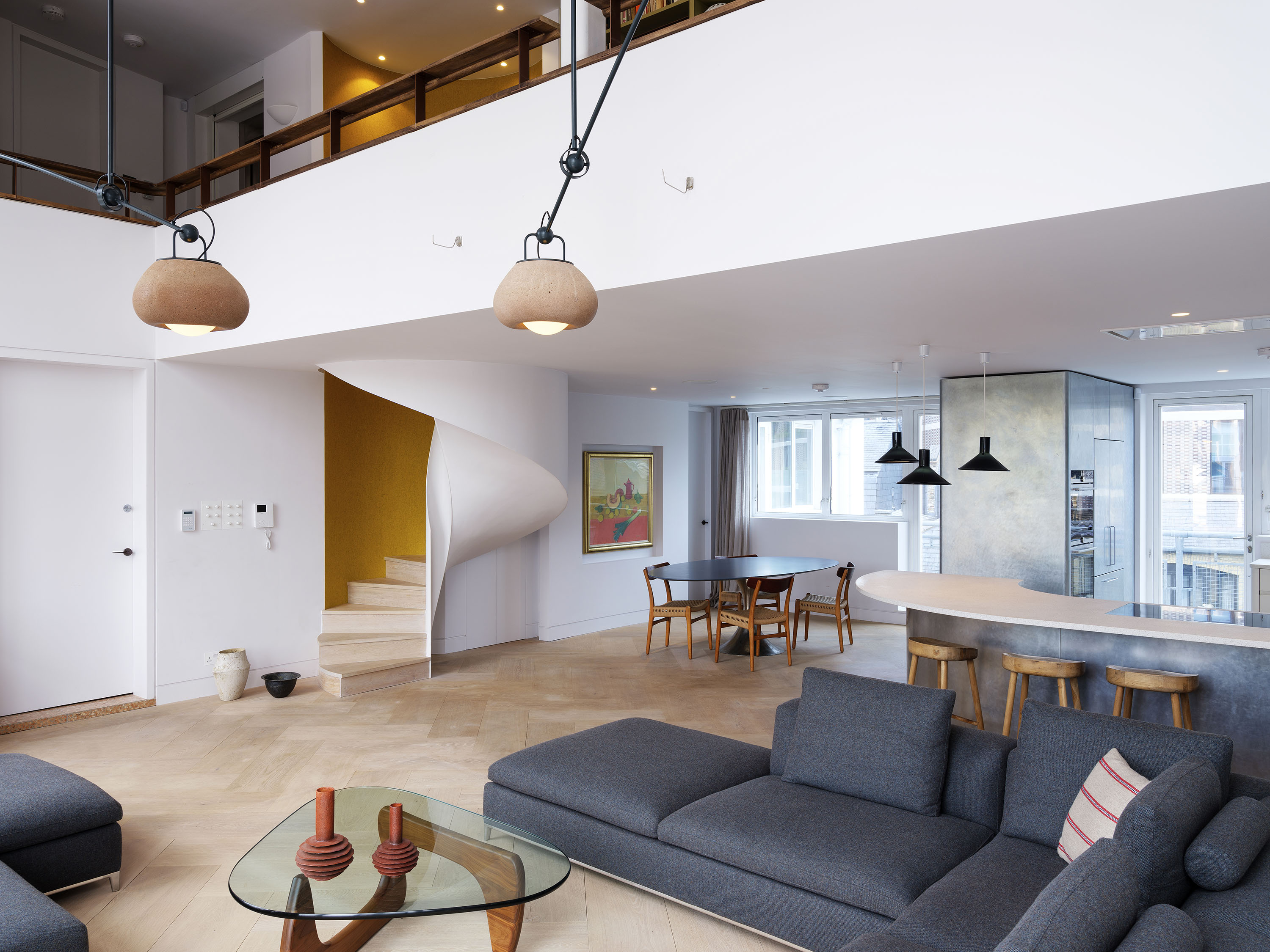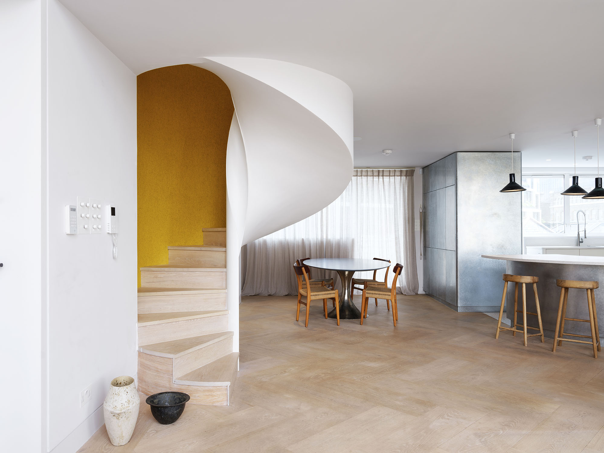 The two floors of this penthouse hinge around a new stair construction which spirals into the main living space and marks the transition from the light material palette of the public spaces to the richer, warmer palette of the private spaces.