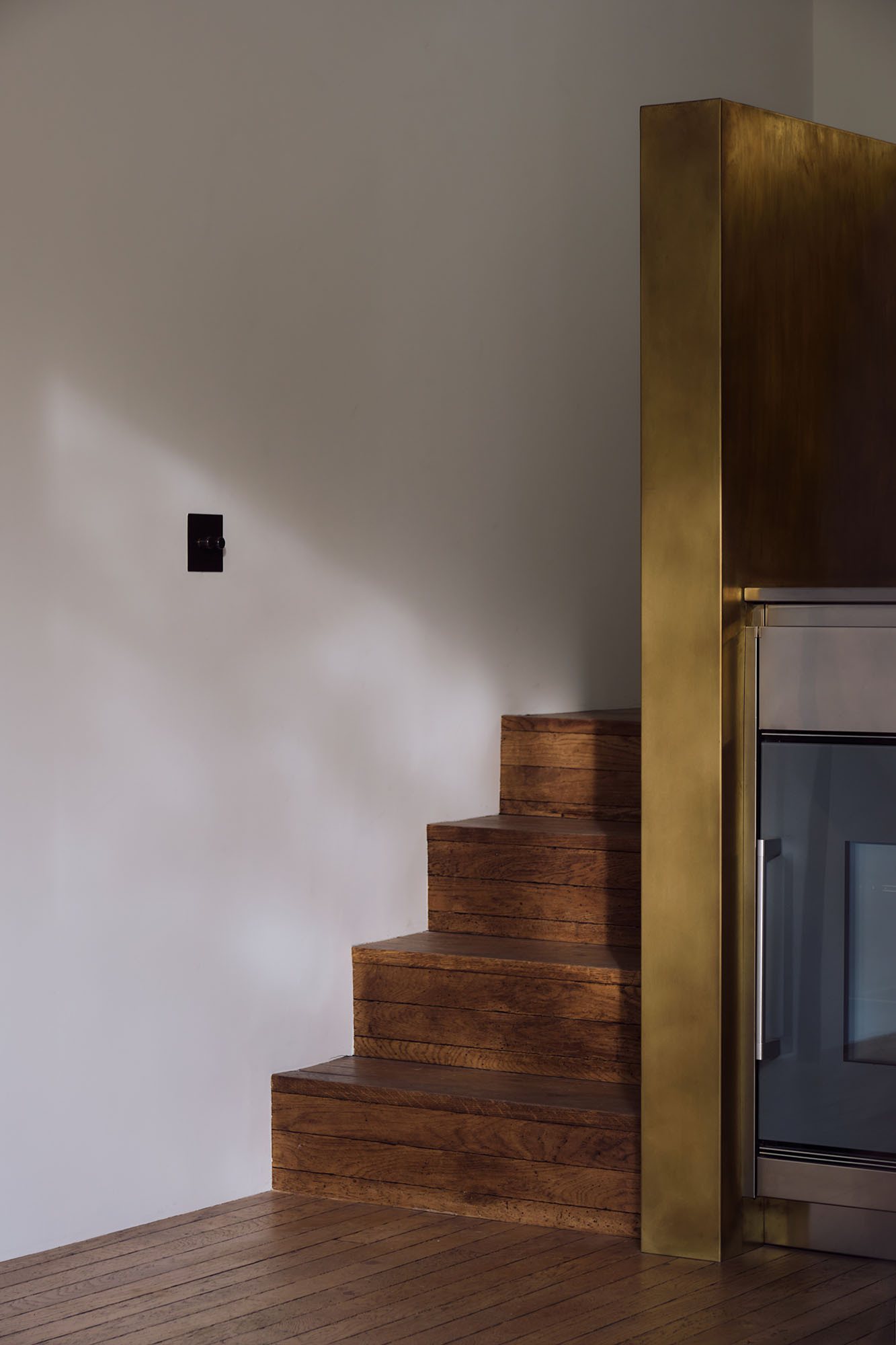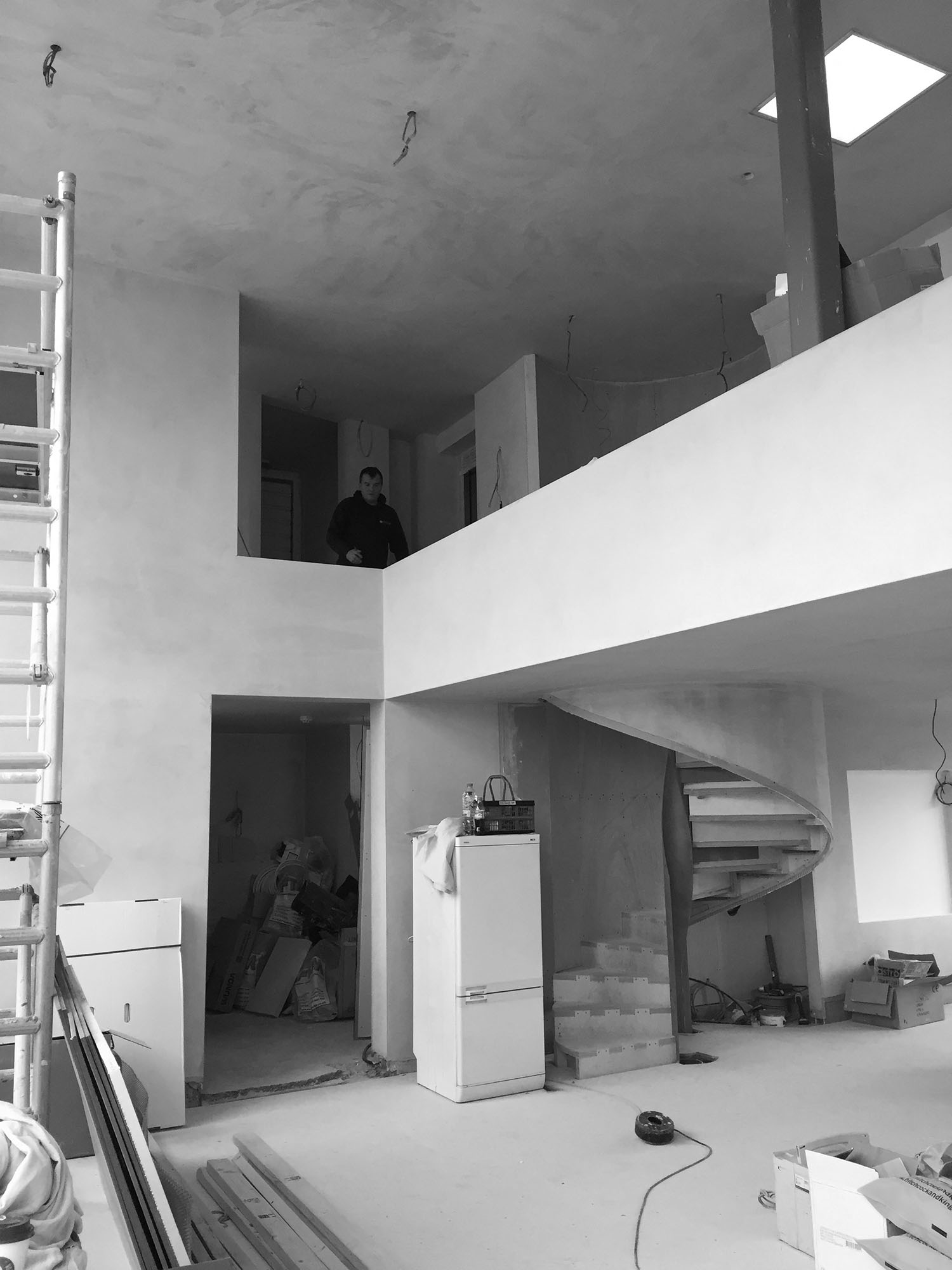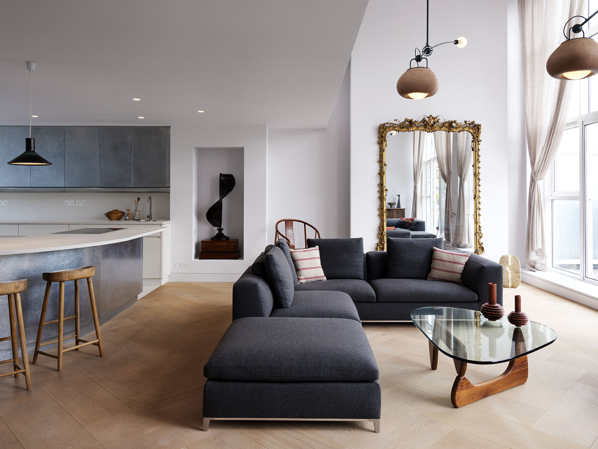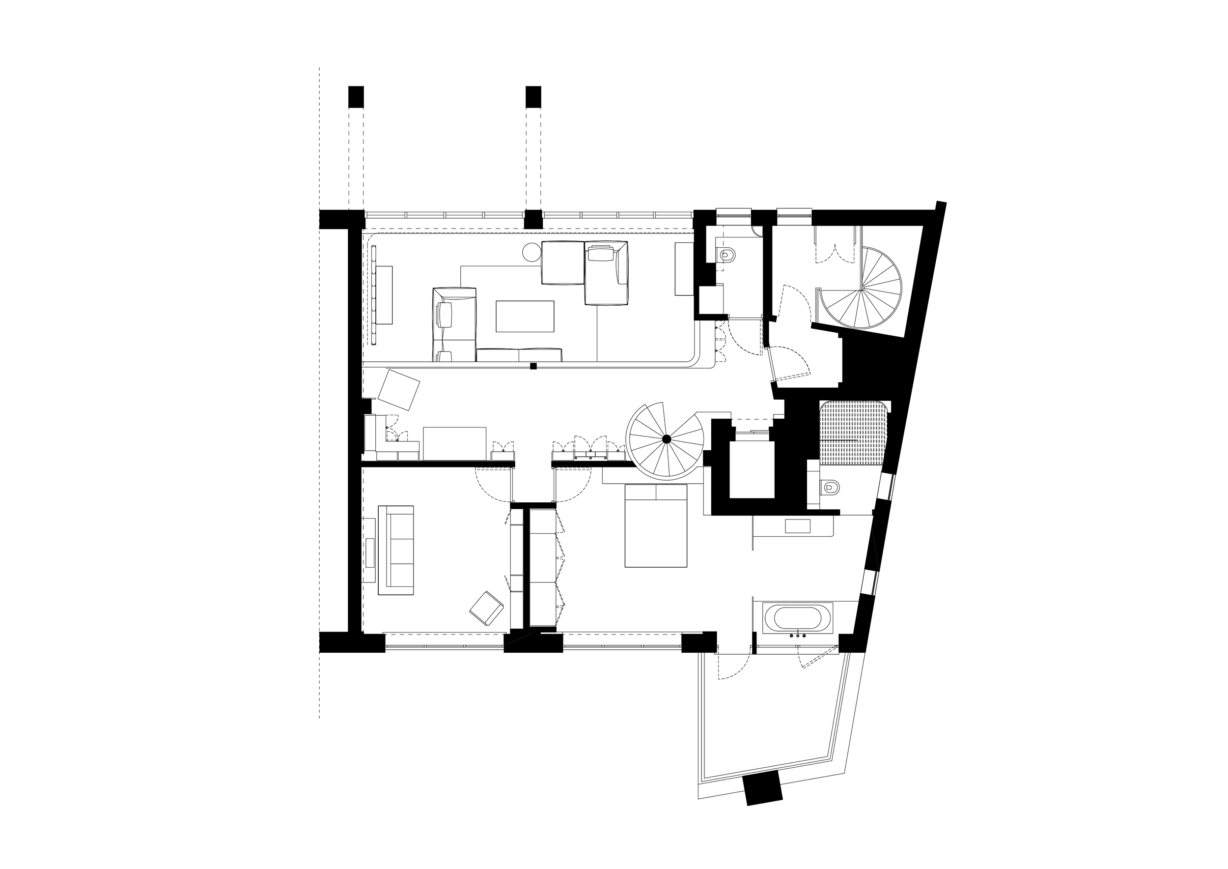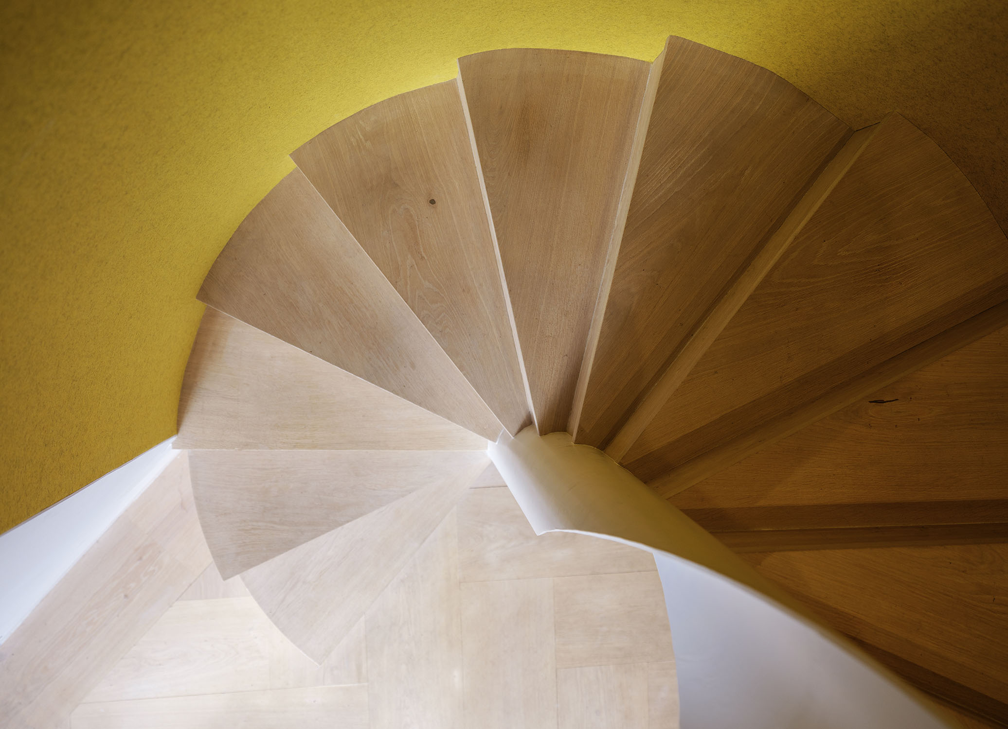 The two floors of this penthouse hinge around a new stair construction which spirals into the main living space and marks the transition from the light material palette of the public spaces to the richer, warmer palette of the private spaces.