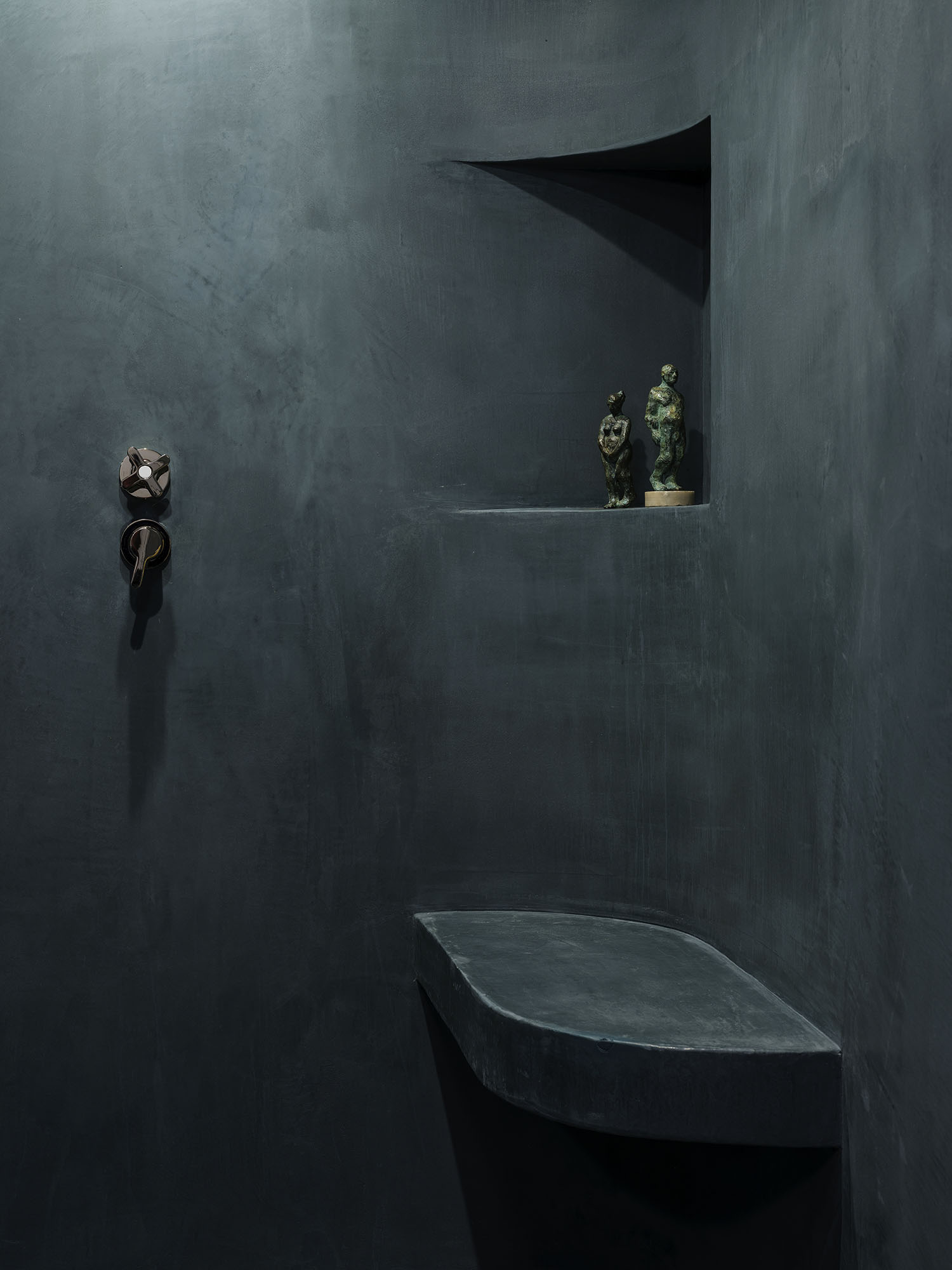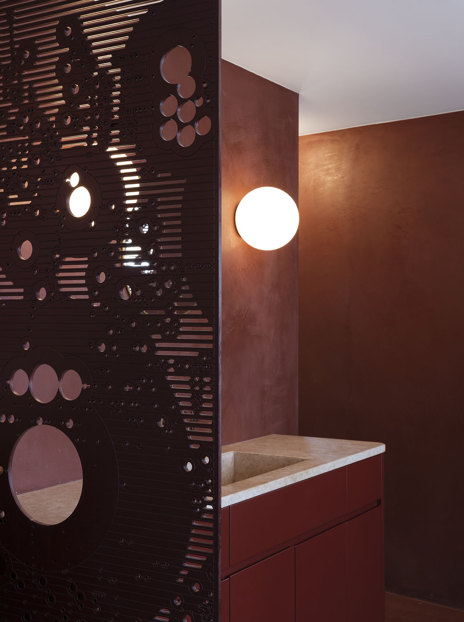 A mezzanine library overlooks the double height living space, occupied by a pair of bespoke pendant light fittings, designed to the client's brief to fit the space. Bold use of colour and texture lend the private spaces a warm richness.