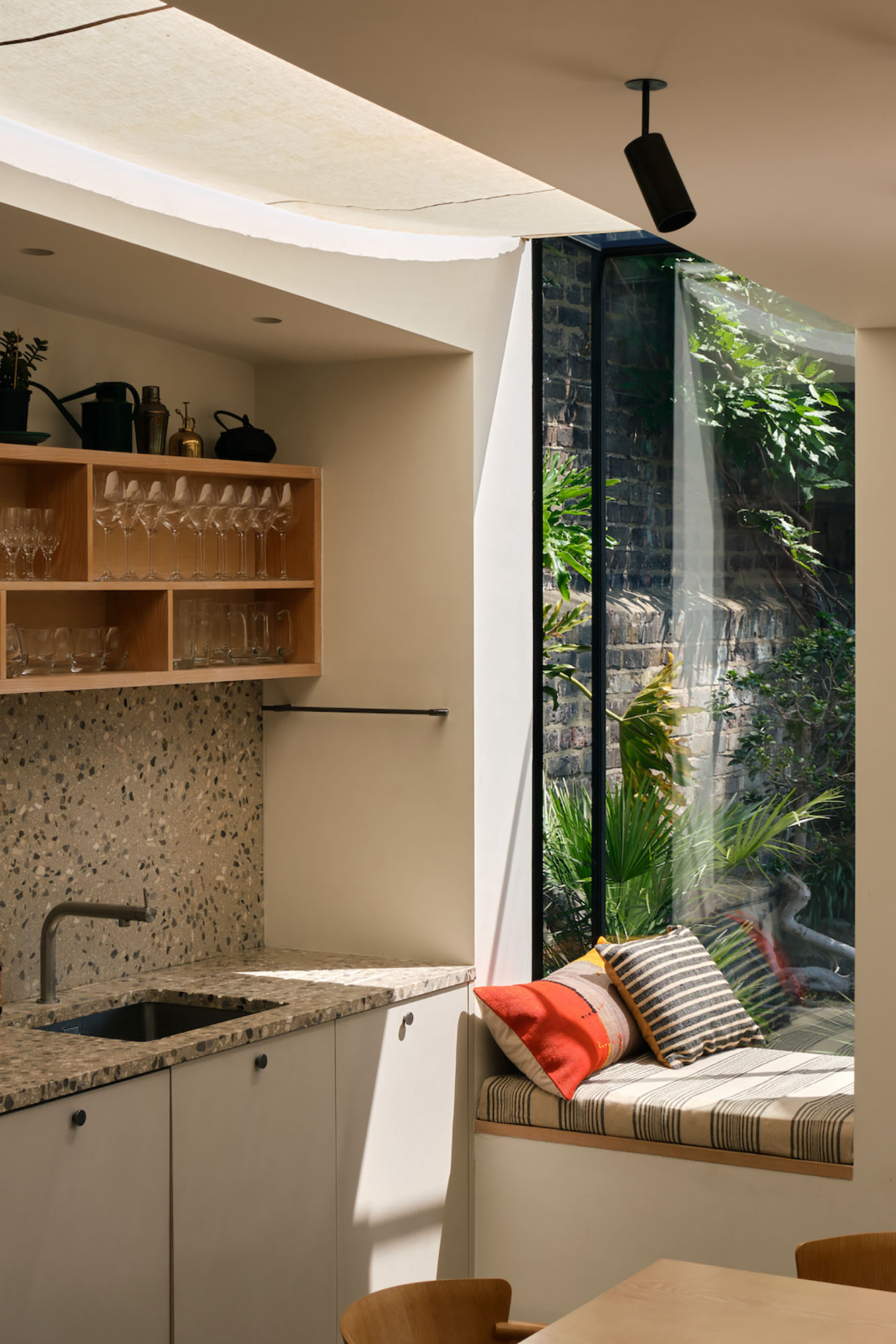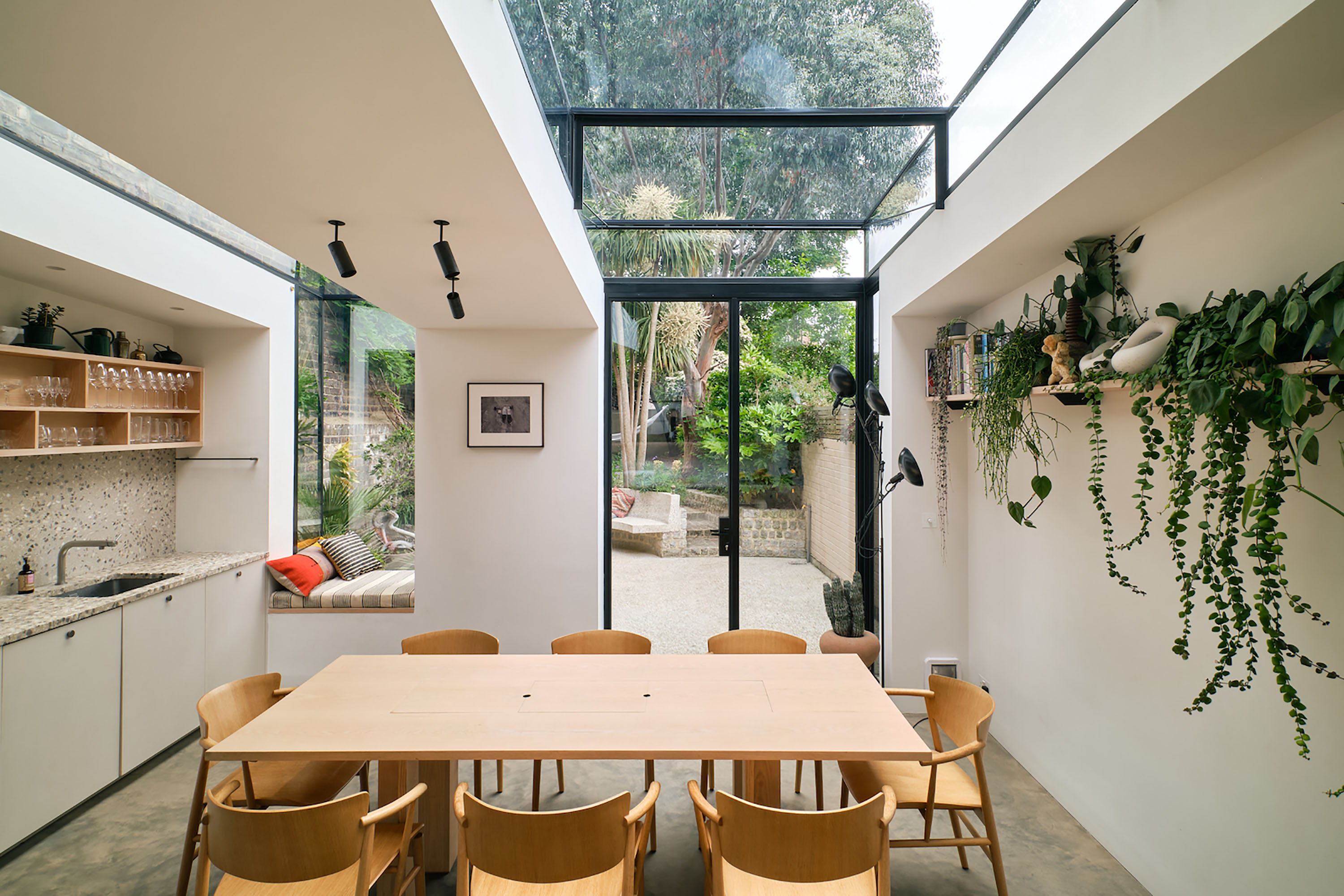 From front sitting room, through family kitchen, to garden seating to garden greenery, a continuity of space is maintained which only strengthens the sense of nestled domestic living. In amongst the major zones, small moments, such as a projected window bay, are stolen from the overarching spatial organisation.