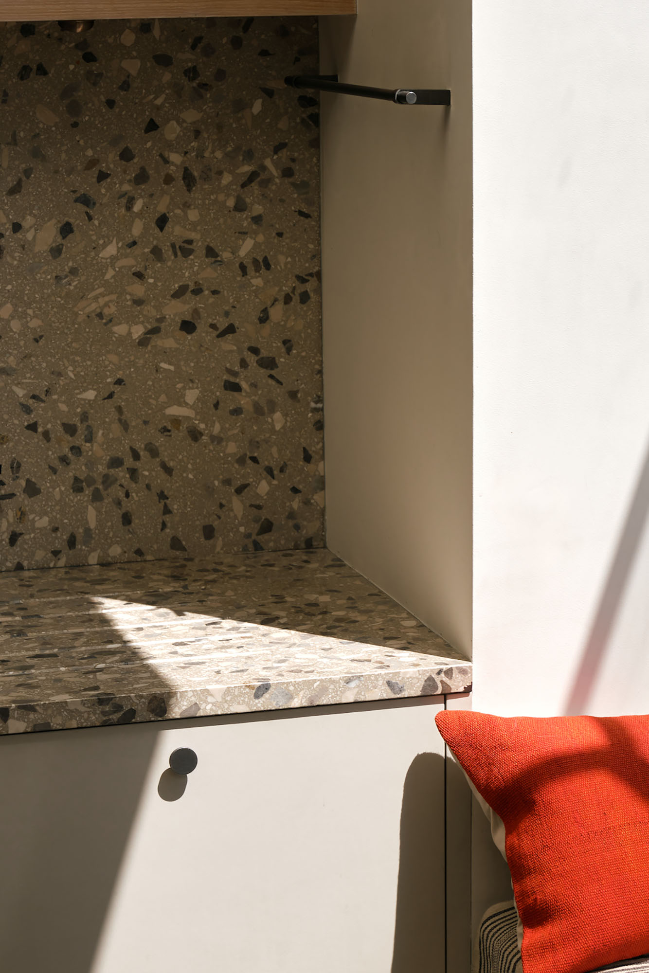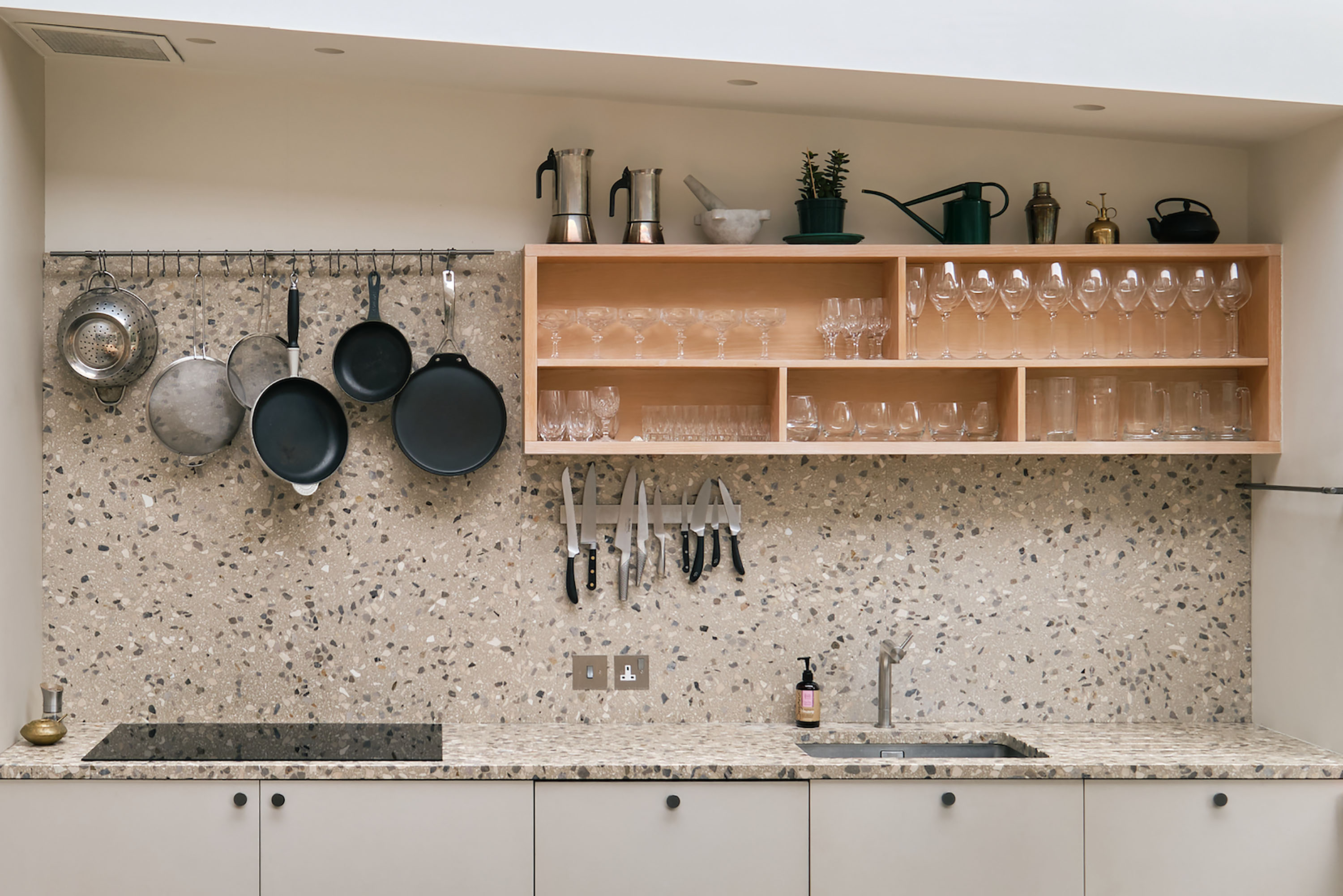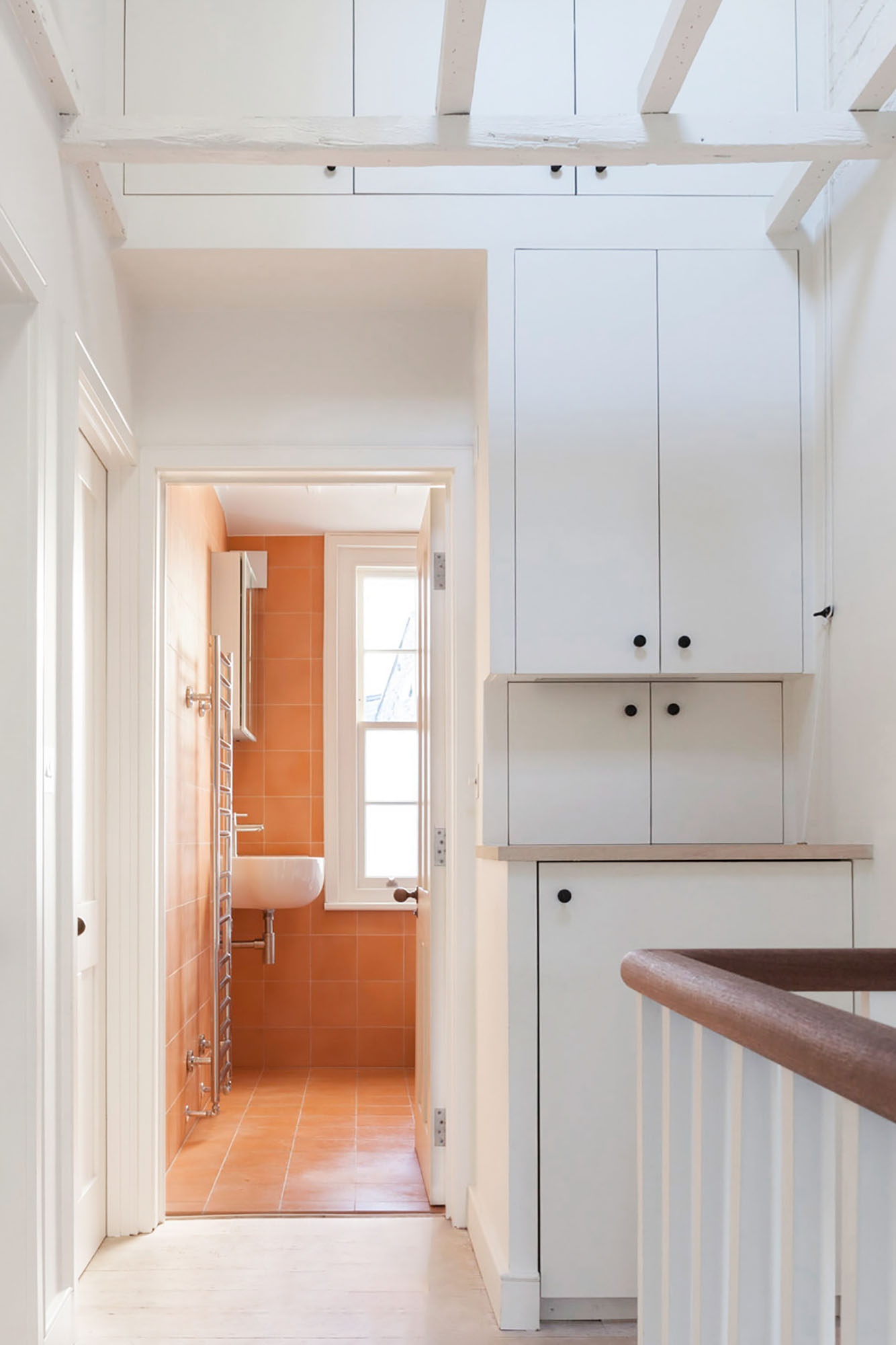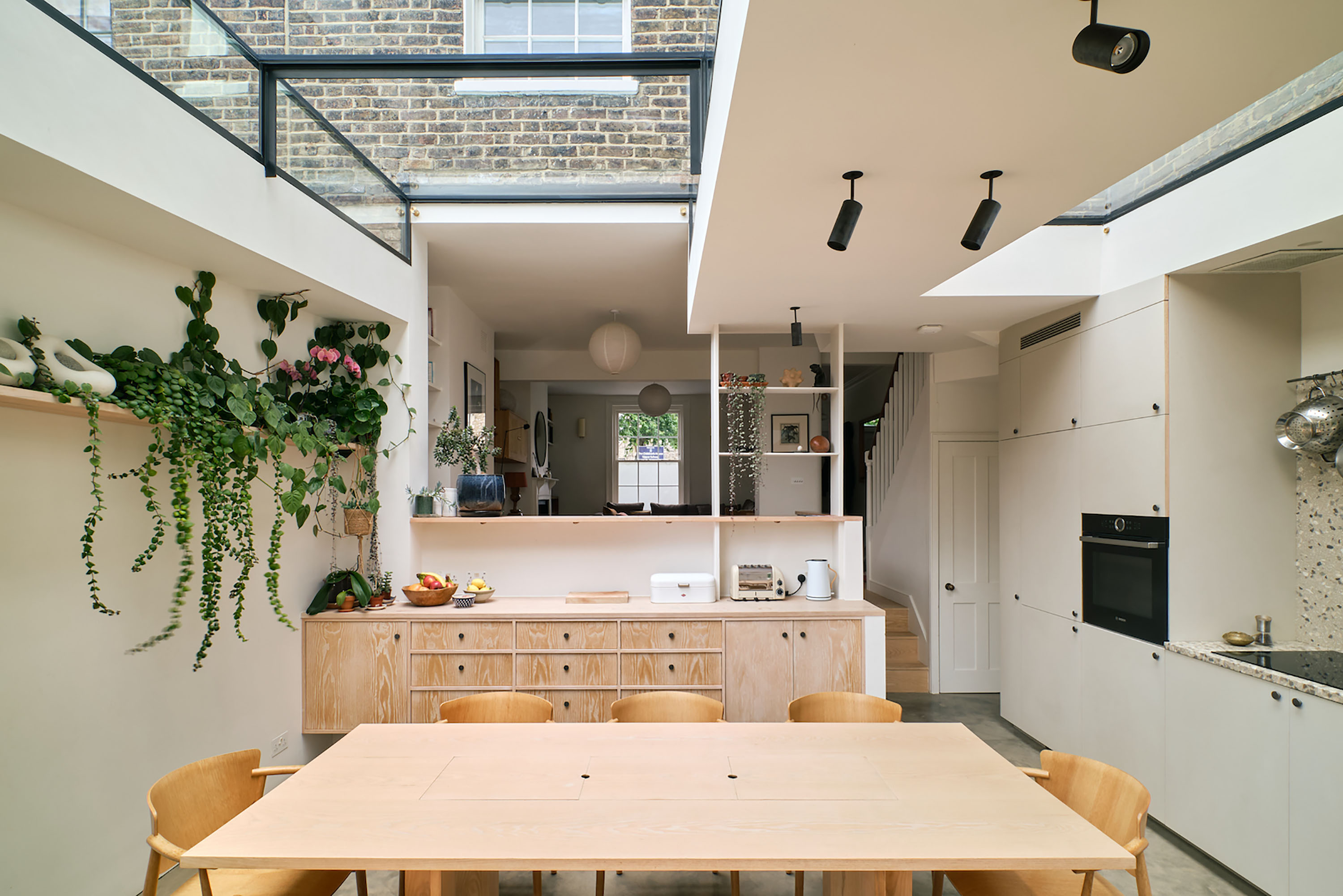The modest character of the building's upper floors is preserved, and a sense of generosity achieved by lofting the space and bringing in light from above.
