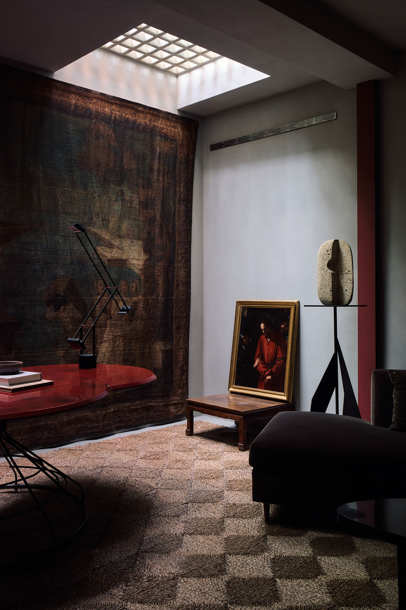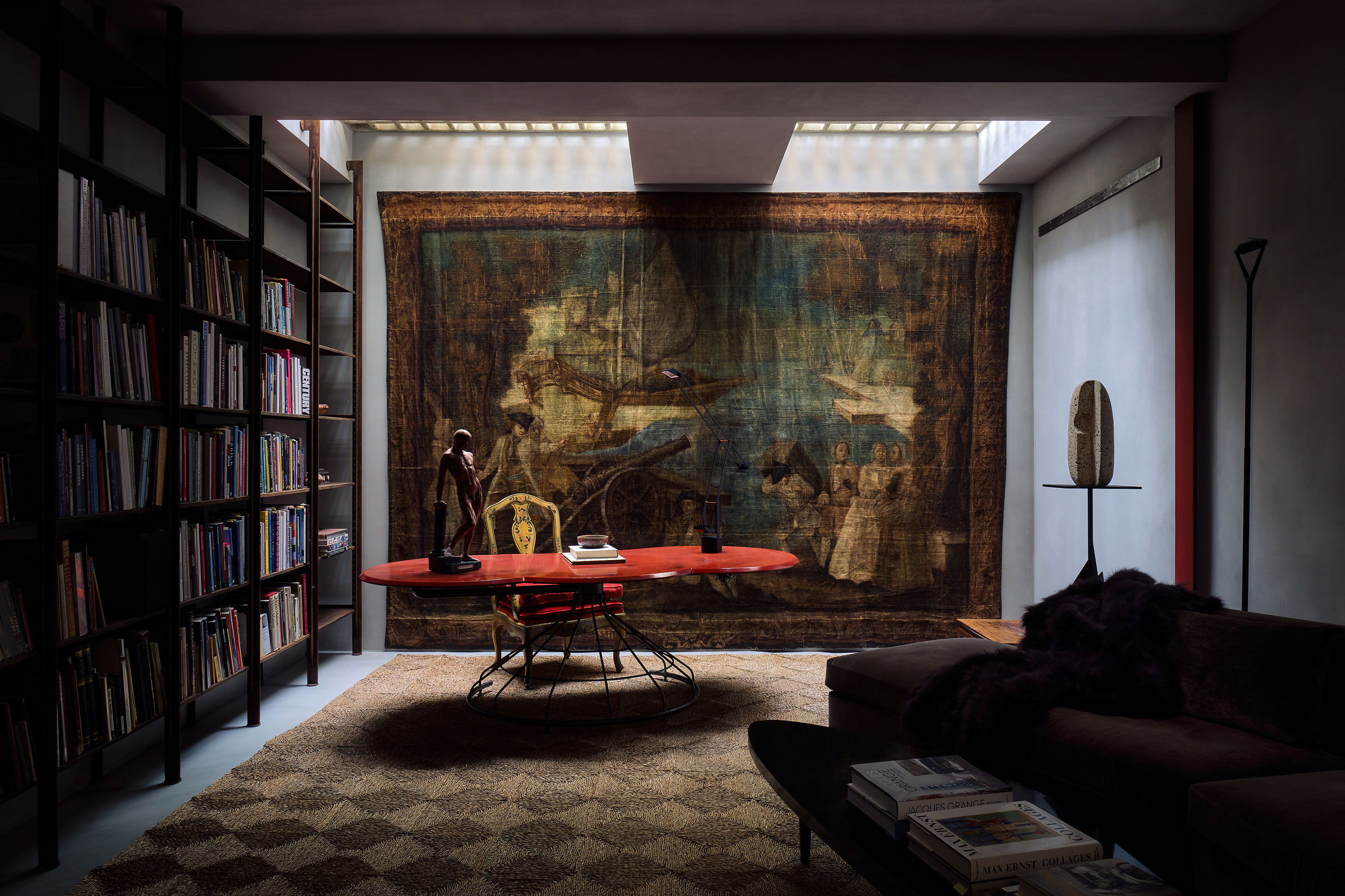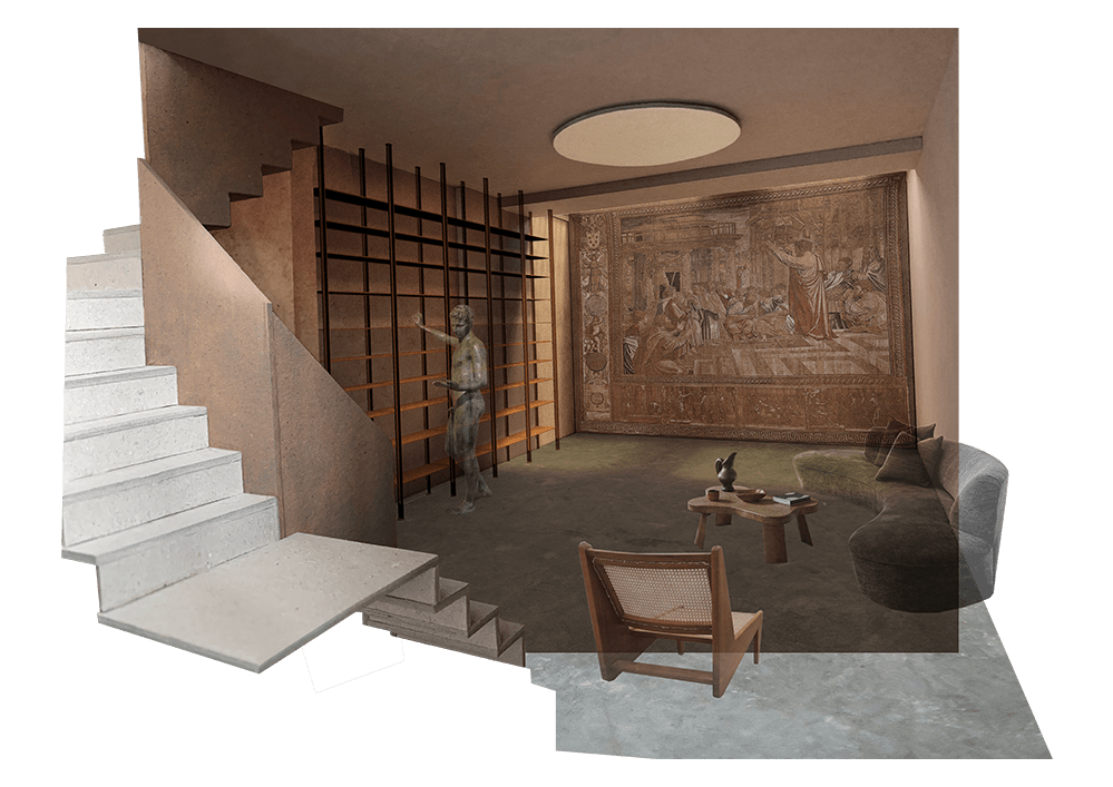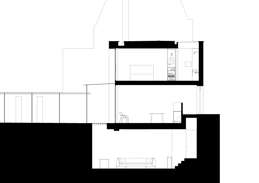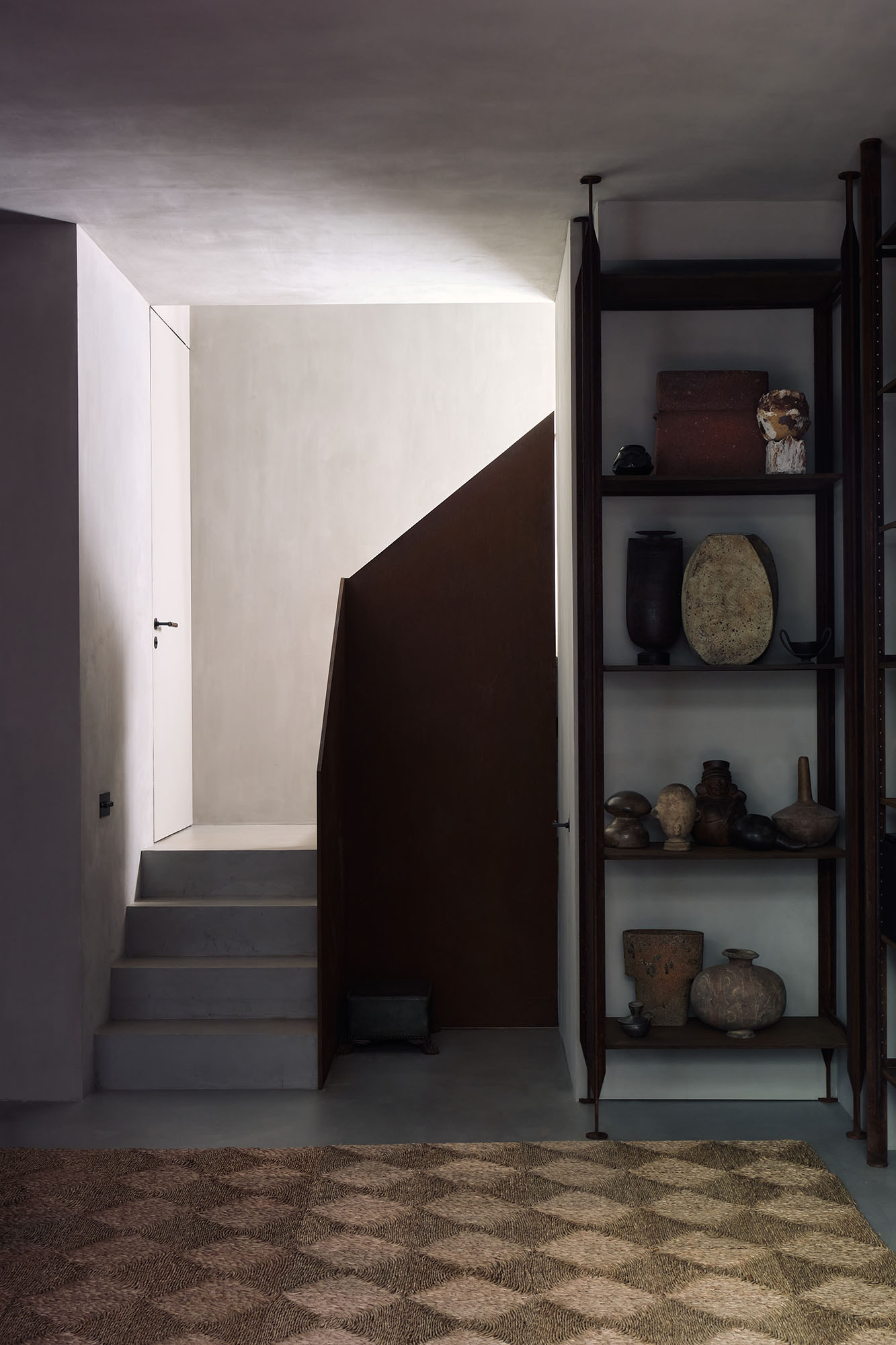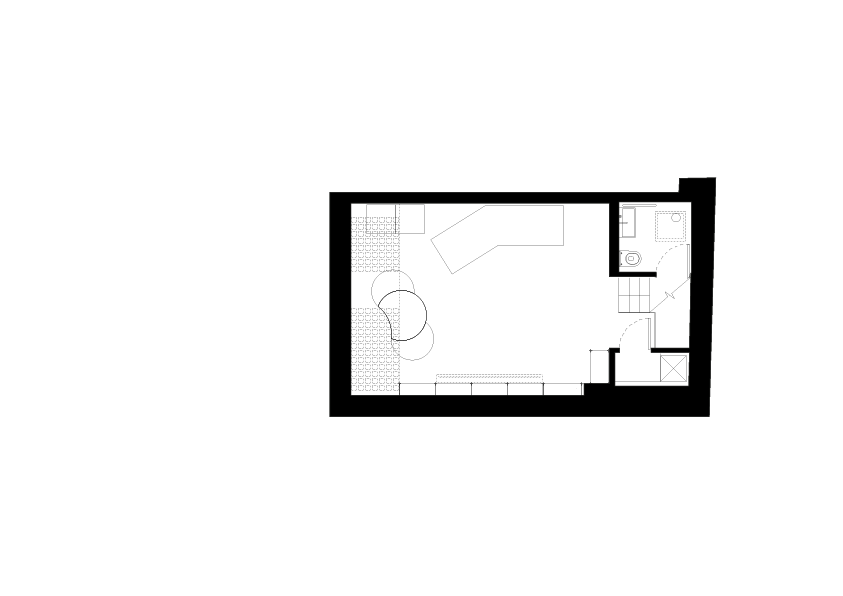 The design of a new basement fully embraces its necessarily restrained use of natural light sources. A large studio room is bookended by natural light spilling down a stair void at one end and garden pavement lights at the other. Contrast and chiaroscuro are used to give the studio space a visual warmth and drama that is reiterated by the material choices and design detailing.