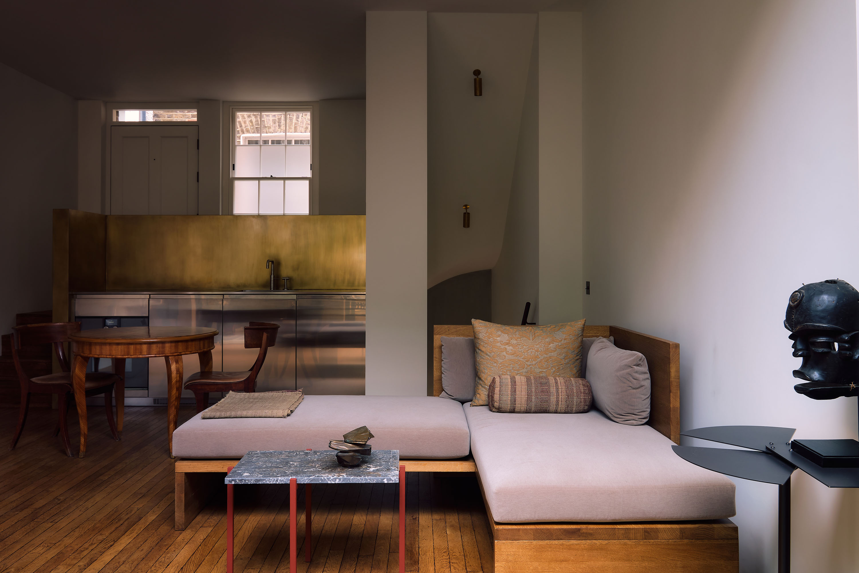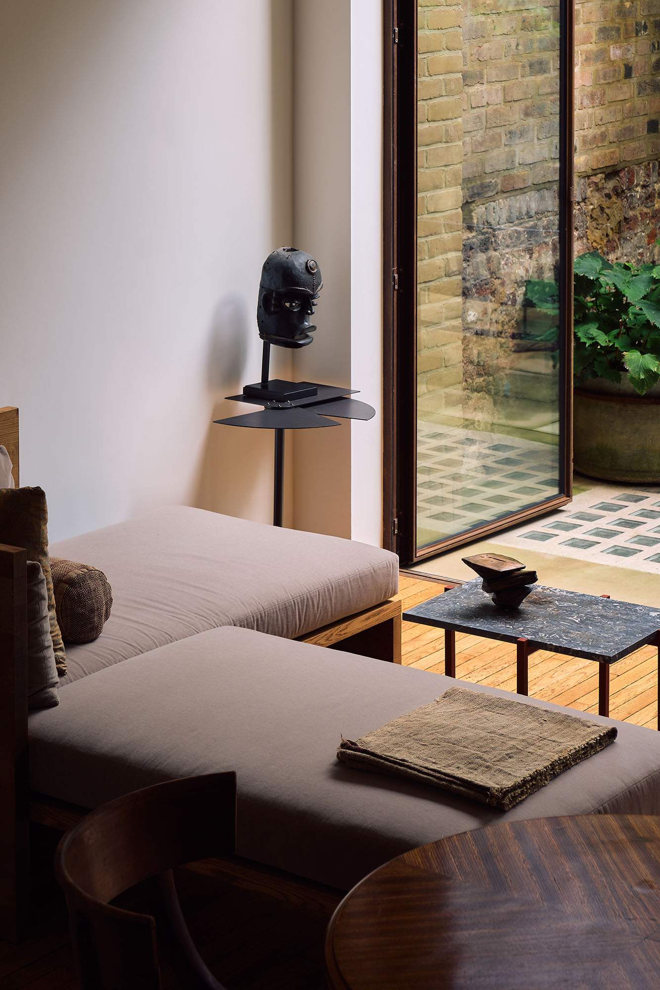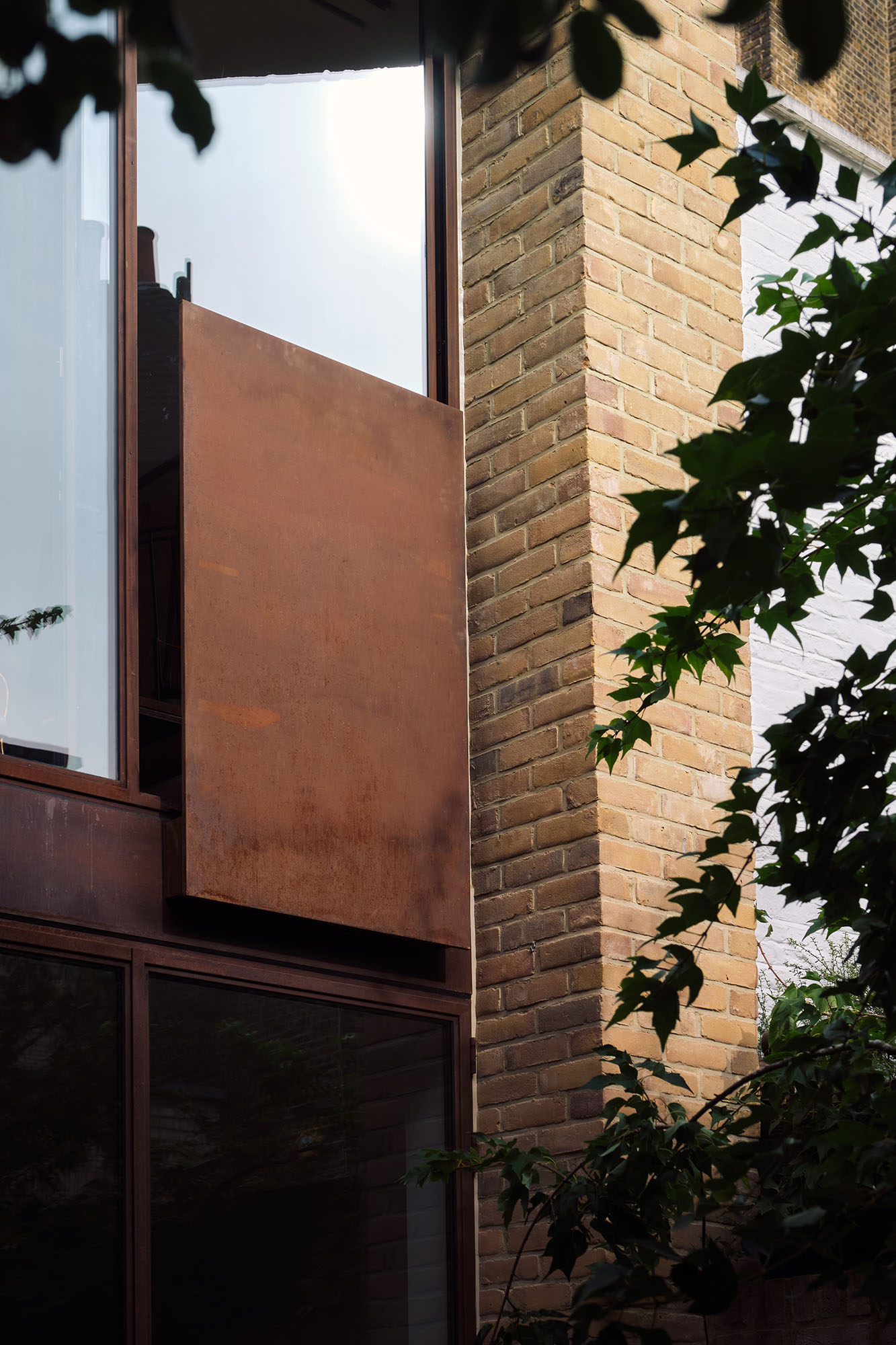The ground floor of this new mews house presents a quiet face to the street, whilst fully opening up to the dappled light of its sheltered garden. The robust brickwork of its garden facade is echoed in the massing of the interior, but there is a shift in the material palette towards a more varied and generous tactility.