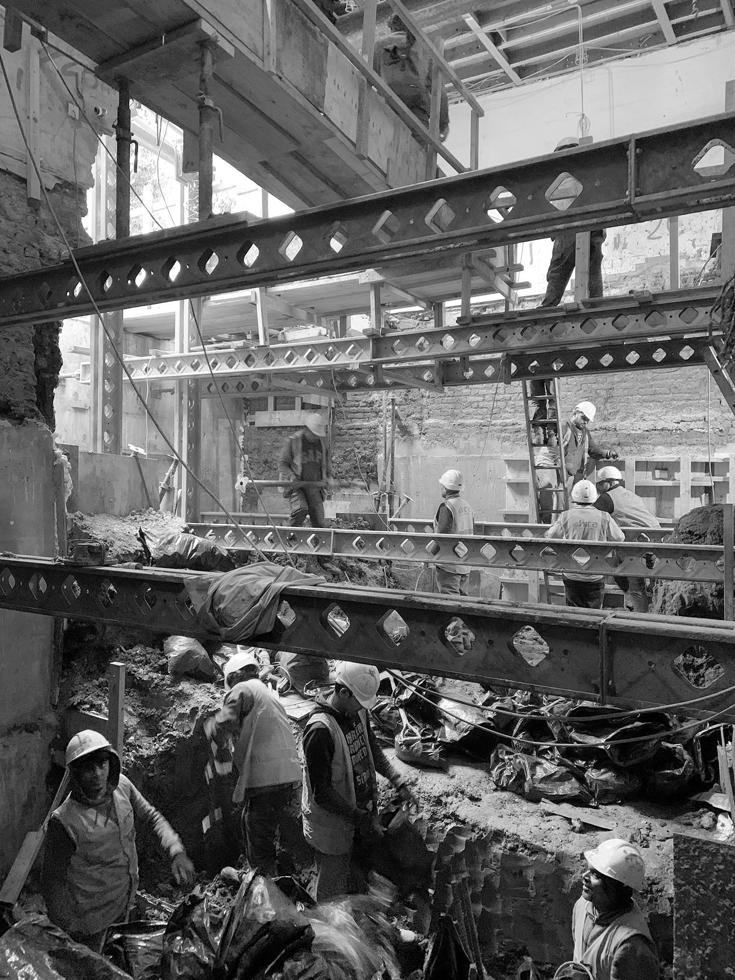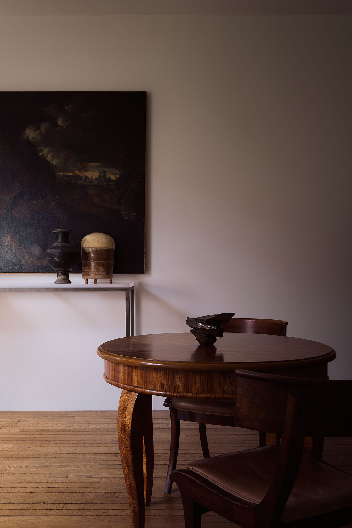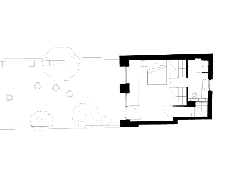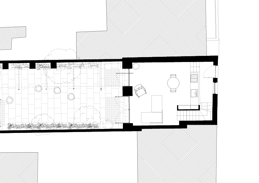 The ground floor of this new mews house presents a quiet face to the street, whilst fully opening up to the dappled light of its sheltered garden. The robust brickwork of its garden facade is echoed in the massing of the interior, but there is a shift in the material palette towards a more varied and generous tactility.