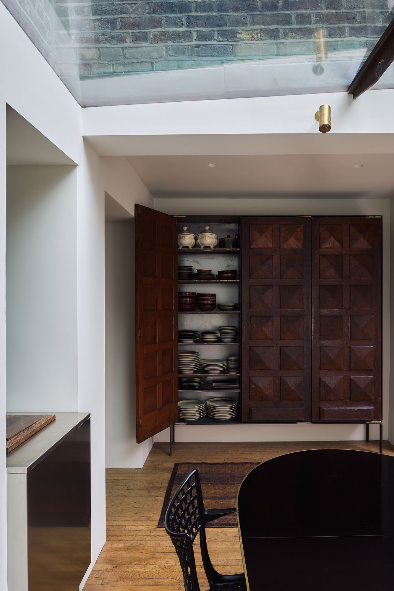 A new extension sits gently within the surrounding brickwork. It is formed from a cruciform glazed roof structure that clings to its masonry perimeter, and a set of glazed doors that echo the materials and detailing of the roof.